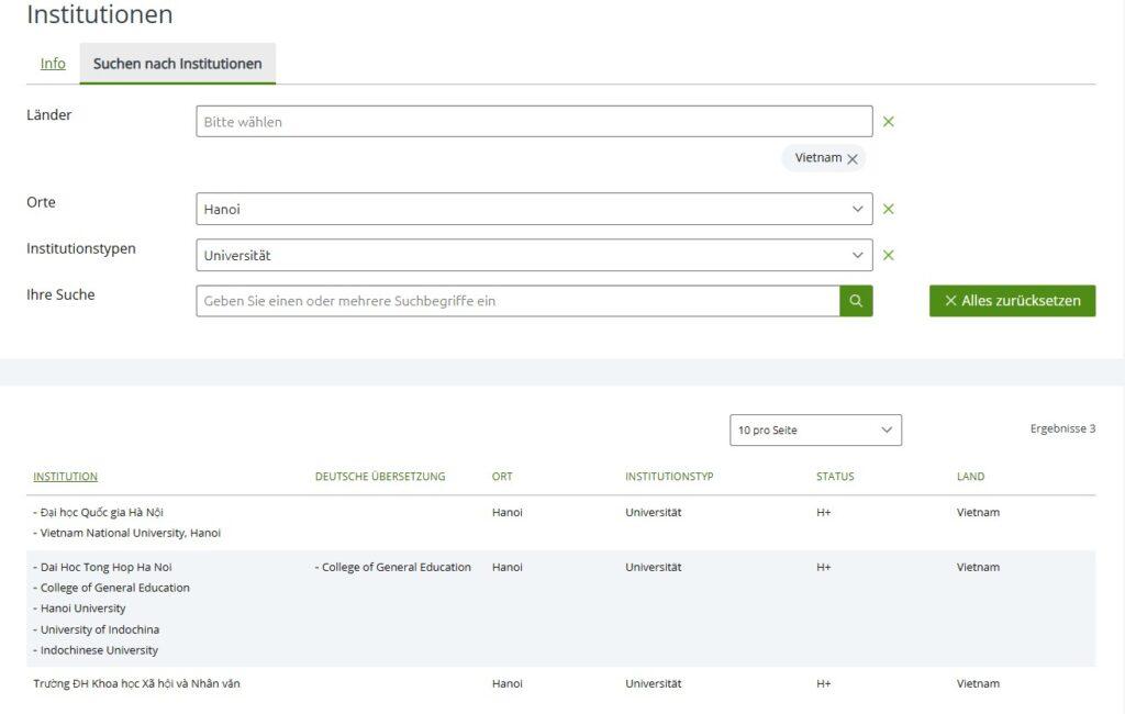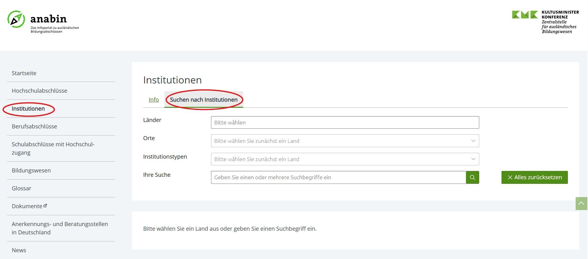 Hướng dẫn tra cứu trên Anabin theo tên trường (Institutionen)
